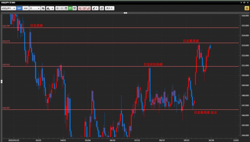 2025年10月27日のドル円を日足〜1時間足まで環境認識。現在のトレンドと注目ゾーンを確認し、押し目買い・戻り売りの可能性を整理します。(2025年10月27日 10:30時点)