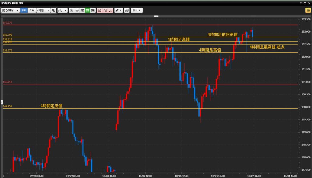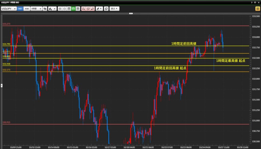 - 152.80より上で1時間足実態が確定 → 日足最高値(153.27)を狙うロング